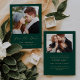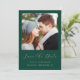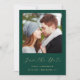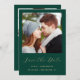 Este simples e minimalista Cartão Salvar a Data contém uma foto quadrada acima das palavras "Salvar a Data" em um elegante roteiro de escrita manual dourada, seguido pelos nomes do casal, data do casamento e cidade em sans serif em um fundo verde esmeralda. Adicione uma segunda foto horizontal e uma mensagem mais detalhada com informações adicionais sobre o contrário.