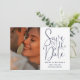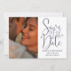 Este convite para salvar a data do casamento com o script elegante azul marinho pode ser personalizado com suas duas fotos especiais, informações sobre o dia do casamento e o código QR do site do casamento. Projetado por Thisnotme©
