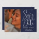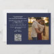 Este convite para salvar a data do casamento com o script elegante azul marinho pode ser personalizado com suas duas fotos especiais, informações sobre o dia do casamento e o código QR do site do casamento. Projetado por Thisnotme©