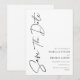 Isto é um minimalista e chic salvar a data de um casamento. É um design de script simples e na moda, escrito à mão, em preto clássico e branco. Entre em contato com o designer para obter informações sobre este design.