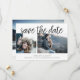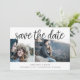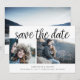 Um cartão moderno para guardar a data projetado para acomodar três das suas fotos favoritas de noivado, com duas na frente e uma foto de sangria de cheio adicional na parte traseira. "Salve a data" aparece acima das suas fotos em caracteres de script de estilo manuscrito preto, com seus nomes, data do casamento e local do casamento embaixo. Adicione seu site de casamento às costas, assim como uma indicação de que um convite formal se seguirá.