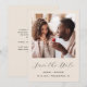 Este simples e minimalista cartão de Save the Date apresenta uma foto quadrada acima das palavras "Save the Date" em elegante letra cursiva preta, seguida pelos nomes do casal, data do casamento e cidade em fonte sans serif em um fundo bege neutro. Adicione uma mensagem mais detalhada com informações adicionais no verso.