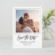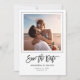 Anúncio minimalista moderno de Salve a Data com tipografia manuscrita de roteiro moderno, sua foto pessoal dentro de uma moldura fina e elegante ao lado de seu nome e data do casamento.