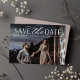 Um cartão de data moderno, projetado para acomodar sua foto favorita de noivado de sangramento horizontal ou orientada a paisagem. "Salve a data" aparece no topo da sua foto em caracteres brancos e em letras de guião, com seus nomes, data do casamento e local do casamento embaixo. Cartões invertidos para mostrar detalhes adicionais da data.