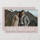 Um cartão de data moderno, projetado para acomodar sua foto favorita de noivado de sangramento horizontal ou orientada a paisagem. "Salvar a data" aparece por baixo da sua foto em blocos de chic e letras de script, junto com seus nomes, data de casamento e local do casamento. Cartões invertidos para revelar detalhes adicionais de data.