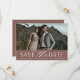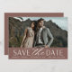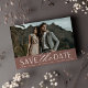 Um cartão de data moderno, projetado para acomodar sua foto favorita de noivado de sangramento horizontal ou orientada a paisagem. "Salvar a data" aparece por baixo da sua foto em blocos de chic e letras de script, junto com seus nomes, data de casamento e local do casamento. Cartões invertidos para revelar detalhes adicionais de data.