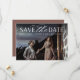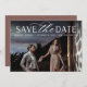 Um cartão de data moderno, projetado para acomodar sua foto favorita de noivado de sangramento horizontal ou orientada a paisagem. "Salve a data" aparece no topo da sua foto em caracteres brancos e em letras de guião, com seus nomes, data do casamento e local do casamento embaixo. Cartões invertidos para mostrar detalhes adicionais da data.