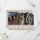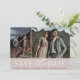 Um cartão de data moderno, projetado para acomodar duas fotos de noivado (uma vertical e uma horizontal) alinhadas lado a lado. "Salvar a data" aparece abaixo em letras de quadras e scripts, junto com seus nomes, data do casamento e local do casamento. Cartões invertidos para revelar detalhes adicionais de data.