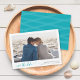 Na moda Salve o Cartão com fotos Data com sua foto em uma borda branca, abaixo da qual estão as palavras "Salvar a Data" em um script cursivo relaxado. A placa inclui um fundo azul turquesa com linhas sobrepostas. Personalize-o substituindo o texto do marcador de posição e substitua a foto do marcador de amostra/marcador de posição por sua própria foto. Para obter mais opções, clique no botão "Personalizar". *Observe que a Marca d'água do Zazzle que aparece na visualização de zoom NÃO aparecerá no produto impresso final. © Rosewood e Citrus