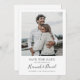 Este simples casamento de fotos quentes, salve o cartão de data, tem um design quente e minimalista. Os recursos frontais SAVE O texto DATA acima dos seus nomes e data e local do casamento. A cor padrão do texto em ambos os lados é uma cinza muito escura que é na sua maioria negra. Seus nomes na frente são destacados com uma fonte viva e caprichosa de escrita manual que dá um senso de calor e familiaridade a este olhar moderno minimalista. Escolhemos os cantos nítidos como a forma padrão, mas os cantos arredondados também funcionam maravilhosamente com este design, então tente ambos os modos de edição e veja quais são os seus! Em ambos os lados, definimos o plano de fundo como transparente para permitir que a cor do papel sirva simplesmente como a cor base. Você pode escolher uma cor para o plano de fundo em um ou em ambos os lados se preferir outro aspecto. Você também pode editar o texto de acordo com as suas necessidades. Talvez você queira excluir um campo de texto que não precisa ou alterar a cor ou a fonte de algum texto. Quando você edita a parte frontal do cartão para mostrar seus próprios nomes, por exemplo, você também pode optar por alterar a cor desse script de escrita manual, ou mesmo substituir o script que escolhemos para uma fonte diferente, etc. Ou você pode mudar 'SALVAR A DATA' para 'SALVAR NOSSA DATA', ou mudar 'vão se casar' na parte de trás para 'são casandos', etc. Use as ferramentas intuitivas de design, sua foto favorita e sua inspiração para fazer com que este casamento de na moda salve a carta de data chata exclusivamente sua!