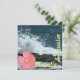 Praia tropical salvará a data com ondas esparramando contra a costa, coral rosa hibiscus e texto ousado divertido. Maneira perfeita de anunciar um próximo casamento de destino perto do mar.