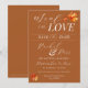 Este original e moderno "Seja Folha no Amor" queimado cor de laranja / ferrugem O casamento do outono salva a data que é adorada com as coloridas folhas de cartazes coloridas na frente e no verso com detalhes elegantes de tipografia de script - o primeiro olhar perfeito para o dia do seu casamento! Personalize facilmente o texto em um snapshot, escolha a forma de data e a textura/espessura do estoque de cartão, e faça o pedido de impressões com envelopes inclusos, ou faça o download do arquivo digital para impressão! Talvez você queira editar ainda mais o posicionamento de seus componentes de texto depois de adicionar seus detalhes - para isso, clique no botão azul "Editar usando a ferramenta design" na parte inferior da janela "Personalizar", navegue até a guia "camadas" na coluna esquerda da tela, selecione a camada frontal ou traseira e clique no elemento de camada que você gostaria de alterar e torne-a sua! ** Veja o convite formal de casamento correspondente e coordene designs na coleção "Be Leaf In Love" - continue rolando para ver a coleção abaixo, ou vá para minha frente de loja do Zazzle e veja a coleção na sua totalidade, lá: Clique no botão "mensagem" ou envie-mail diretamente (com tempo de resposta rápido!): contact@figandlilyco.com. Design é carinhosamente criada por Fig e Lily Studios - enviando bênçãos e obrigados!