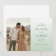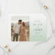 This wedding save the date card features a modern, minimalist design with a balanced layout split into two sections. The left side showcases an outdoor photograph of a couple in earthy tones against a desert backdrop, while the right side uses a soft mint green gradient for a serene and romantic feel. Elegant typography highlights the names and event details, creating a focal point with bold serif fonts. The overall style is sophisticated and straightforward, perfect for conveying essential information with visual appeal. Ideal for couples seeking a chic and understated invitation suite.