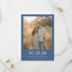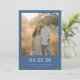 This wedding save the date features a warm, naturalistic design with a central photograph of two individuals in an outdoor setting surrounded by tall grass and trees. The color palette includes golden yellows, earthy browns, and muted greens, complemented by soft pastel clothing tones. The layout is simple yet elegant, with a navy blue border framing the image and clean serif typography for the date and location details. The mood is serene and romantic, capturing a sense of intimacy and tranquility, making it perfect for couples looking to set a nostalgic yet hopeful tone for their special day.
