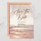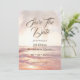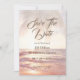 Como as belas e calmantes águas da praia, o anúncio "Salve a Data" vai trazê-lo ao mesmo tempo. Um cenário tropical de galhos de palma no topo, ondas oceânicas e pôr do sol na frente com informação personalizável. Um pêssego, fundo de coral com pontos de sepia ouro, e também incluir sua foto favorita.