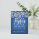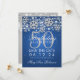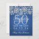 "50ª Festa de aniversário" elegante, salve a design de data com Silver Faux Glitter Snowflakes e bokeh brilhantes sobre fundo azul, e o nome personalizado + texto de detalhes.