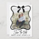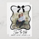 This black and white wedding save the date features a single centered photo framed by a simple swirling ribbon-style border. A small hand-drawn bow sits at the top, adding a soft touch above the image. Below the framed photo, “Save The Date” appears in handwritten script, with space underneath to center the couple’s names and wedding date.