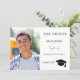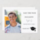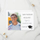 On front: Add your own vertical size photo of the graduate. A chic white background, black text. Templates for a name and date. The name is written with a modern hand lettered style script. With a cap, tassel topper.