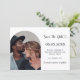On front: Add your own vertical size photo. A chic white background, black text. Templates for names and the date. The name and the text: Save the Date are written with a modern hand lettered style script with a heart.