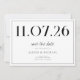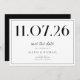 Um simples cartão moderno. Personalize este design branco e preto para ter a data do seu casamento, nomes e detalhes.
