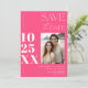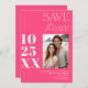 Este cartão moderno de salvação apresenta um design elegante e minimalista, perfeito para casais que amam uma estética limpa e sofisticada. O cartão exibe com destaque a data do casamento em negrito, grande tipografia no lado esquerdo, garantindo que a data se sobressai e seja facilmente percebida. No lado direito, há um espaço dedicado para uma foto do casal, adicionando um toque pessoal ao anúncio. O texto é elegantemente arranjado em uma fonte contemporânea, mantendo o foco nos detalhes essenciais como os nomes dos casais, a data do casamento e a localização. O uso de néon rosa e branco quente cria um aspecto eterno, fazer este cartão como uma escolha na moda para qualquer casamento moderno.