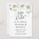 Casamento de aspas inspiradoras Salve o cartão de data retrata um elegante design floral de aquarela com simples margaridas brancas e verde. A parte de trás apresenta Bíblia Verso 1 Corintianos 13:4, "O AMOR é paciente, o AMOR é gentil. Não inveja, não se vangloria, não se orgulha."