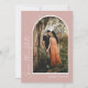 Este moderno Elegante Simples Salve o Cartão de Data o ajudará a compartilhar as boas notícias do seu noivado e do próximo casamento. Este estilo minimalista apresenta duas fotos em um fundo cor-de-rosa com um design de arco e uma fonte moderna de script. Personalize com suas próprias fotos e detalhes sobre seu casamento.