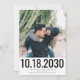 Cartão de Save the Date de casamento 5x7 vertical com um design de tipografia simples e moderno com data em fonte fina e grande sobreposta à sua foto que você carrega no modelo e digita seus nomes e local e data do casamento para um design rápido e fácil que funcionará com qualquer tema que você escolher posteriormente. As cores de fundo e as fontes são editáveis para combinar com seu esquema de cores, e você pode adicionar mais informações ou fotos adicionais no verso.