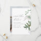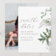Um belo casamento botânico salve o cartão de data com flores silvestres e verde de cor aquática simples, com bonito salvamento do roteiro de caligrafia e uma foto de cheio.