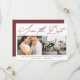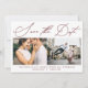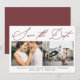 Um simples roteiro de caligrafia "salve a data" com duas fotos e um burgundy vermelho de volta, moderno e mínimo guarde o cartão de data.