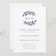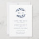 Traje Azul Branch Monograma Wreath Branco Casamento Salva a Data... Nosso minimalista de tendência Salvar a Data apresenta uma coroa azul de slate monograma de ramos de oliveira em um fundo branco nítido seguido por texto de convite em serif elegante e sans serif typografia para um convite simples e chic Salvar a Data. A parte traseira do cartão contém as informações do site do casamento e um exemplo de gráfico de código QR que você pode substituir simplesmente digitando o URL do seu próprio site de casamento na modelo. O código QR e o texto de exemplo em ambos os lados da placa podem ser facilmente revisados passo a passo com seus próprios detalhes no modelo de personalização.