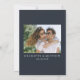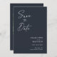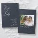 Cartões com fotos modernos, minimalistas e elegantes do noivado de casamento "Salvem a Data". Este design personalizado com elementos de texto moderno com um script de tinta de caligrafia exclusivo. A foto dos casais destaca a parte traseira da placa. As cores são brancas escrevendo em azul de ardósia ou personalizam facilmente a cor base conforme necessário.