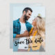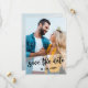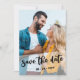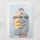 Guarde a data com dois retratos de cheio sangrados do casal feliz. A foto na frente tem uma cobertura translúcida, cortada em um ângulo geométrico e manchada com "salvar a data" em um script de pincel de salto. A foto no verso tem uma camada de estilo faux vellum de cheio para guardar seus nomes, data de casamento e quaisquer informações adicionais que você queira fornecer neste palco.