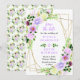 This fun and whimsical save the date invitation features watercolor purple flowers and foliage on a gold geometric frame. The text combines handwritten script and serif fonts for a stylish and modern look. This is perfect for a spring or summer rustic wedding.