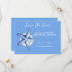 Um belo e elegante peixe-estrela azul e branco de aquarela repousa contra um círculo branco coberto de falso prata. Os modelos brancos parecem ter o direito de usar o seu texto personalizado. Se você está tendo uma praia; costeiro; casamento costeiro ou tropical este design de "salvar a data" é ideal.