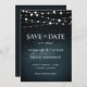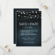 Complemente sua festa de casamento noturna estrelada com esse romântico e fácil de personalizar casamento estelar salve os cartões de data com luzes de cordas em um fundo azul escuro estrelado à noite.