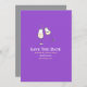 Um cartão simples e minimalista de "salve a data" tem uma ilustração desenhada à mão de duas taças de champanhe inclinadas uma em direção à outra em tom pastel pêssego com bordas em cinza. Elas estão colocadas contra um fundo violeta roxo e têm espaços para a personalização do texto em branco e laranja pêssego abaixo delas. O fundo cinza no verso tem um espaço para informações adicionais, se necessário. São ideais para anúncios de casamentos hetero e LGBTQ+.