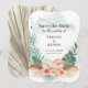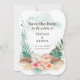 Cartão de Save the Date inspirado em ilhas com arranjo de hibiscos, flores de jasmim e flamingo, e folhas de palmeira com fundo de lavagem de aquarela azul aqua. O verso é uma folha de palmeira leque abstrata em tons de bege caqui e taupe. Perfeito para temas de praia, destino e tropical.