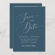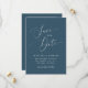 Moderno e mínimo, salve o cartão de data com um roteiro elegante que diz "salve a data" no fundo da rua no meio com as breves informações do casamento. Você pode adicionar uma foto atrás.