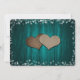 Casamento de teal russo salve o cartão de data com um jarro de mason com luzes de cordas e adornada com dois corações de burlap em um fundo de madeira de celeiro. Personalize facilmente este romântico casamento rústico e romântico de teal, salve a data online. Itens correspondentes disponíveis para complementar este casamento local salvem a data.