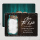 Casamento de teal russo salve o cartão de data com um jarro de mason com luzes de cordas e adornada com dois corações de burlap em um fundo de madeira de celeiro. Personalize facilmente este romântico casamento rústico e romântico de teal, salve a data online. Itens correspondentes disponíveis para complementar este casamento local salvem a data.