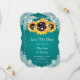 Casamento de teal russo salve o cartão de data com girassóis e luzes de cordas em um fundo de gradação de teal.