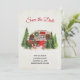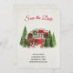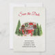 Salve o cartão de data com um tema de Natal bonito e caprichoso. Um trailer aconchegante decorado para o sorteio de Natal entre alguns pinheiros.