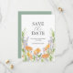 Anuncie seu noivado com este floral, salve o convite de data. Apresenta flores de papoila laranja, lavanda e verde. Use os campos de modelo para personalizar com seu nome e data de casamento. Um elegante design botânico para um tema de casamento de flor silvestre. Para ver a suíte de papelaria do casamento, visite www.zazzle.com/dotellabelle Arte exclusiva e design por Victoria Grigaliunas do Do Tell A Belle.