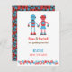 Um fofo par de robôs vermelhos e azuis e engrenagens de vários tamanhos adornam este conjunto de convite de casamento fora do comum. Este design é perfeito para casais que desejam algo único e memorável para anunciar sua celebração.