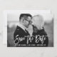 Tendência de Script de Pincel Moderno Salve o Cartão com fotos do Casal de Noivado de Data - Preto e Branco
