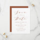 Anuncie sua data de casamento à família e amigos com este minimalista. Ele apresenta uma escrita de incerteza em terracota e tipografia clássica. Personalize adicionando seus detalhes. Este livro que salva o cartão de data é perfeito para qualquer tema de casamento ou estação.