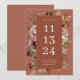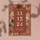 Anuncie seu grande dia com este elegante cartão de "salve a data" com tema de outono, apresentando flores de aquarela suaves em tons quentes de terracota, rosa argila, vermelho argila suave e pau-rosa condimentado. O design combina elementos rústicos e românticos, tornando-o perfeito para casamentos de outono com temas boho, terrosos ou florais modernos. Acentos delicados em rosa e neutros quentes realçam a paleta sazonal, enquanto o layout minimalista mantém o foco na data especial. Disponível como cartão impresso ou download digital.