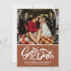Anuncie o seu casamento à família e amigos com esta fotografia esbranquiçada, salve o cartão de aviso de data. Este documento de salvamento técnico apresenta um script branco com letras no plano de fundo do terracota. Personalizar este script salve o cartão adicionando nomes, data de casamento e outros detalhes. Este terracotta salva a data em que o anúncio está disponível em outros estoques de cartão.