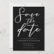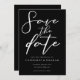 Simplesmente chic e na moda, nossa coleção de casamentos no inverno minimalista apresenta uma elegante tipografia cursiva para seu evento moderno. Envie aos seus convidados uma noite Salve o cartão de data com um visual capturando um script branco em negrito em um plano de fundo preto.